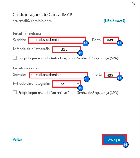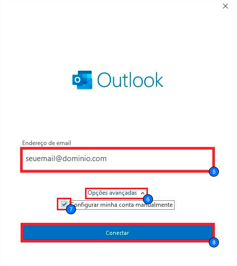 Passo5: Preencha seu email no campo “Endereço de email”, Abrir o campo “Opções avançadas”, marcar a opção “Configurar minha conta manualmente” e clicar em “Conectar”.